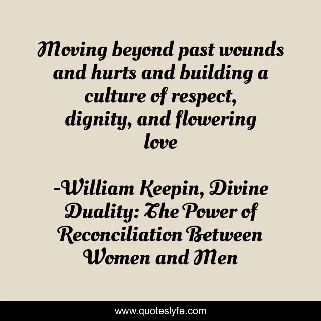 This page presents the quote "Moving beyond past wounds and hurts and building a culture of respect, dignity, and flowering love". Author of this quote is William Keepin, Divine Duality: The Power of Reconciliation Between Women and Men. This quote is about gender-inequality, gender, healing, reconciliation,.