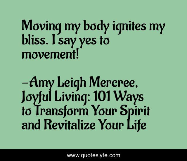 This page presents the quote "Moving my body ignites my bliss. I say yes to movement!". Author of this quote is Amy Leigh Mercree, Joyful Living: 101 Ways to Transform Your Spirit and Revitalize Your Life. This quote is about life, quotes-de-la-vida, amy-leigh-mercree, dancing, dance, quote-of-the-day, joyful-living, quotes-tumblr, joyful-living-101,.