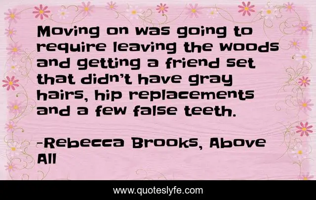 This page presents the quote "Moving on was going to require leaving the woods and getting a friend set that didn’t have gray hairs, hip replacements and a few false teeth.". Author of this quote is Rebecca Brooks, Above All. This quote is about romance, funny, comedy, contemporary-romance,.