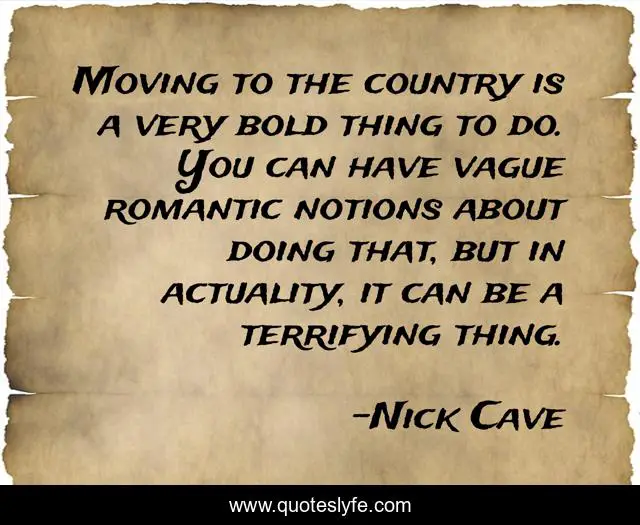 This page presents the quote "Moving to the country is a very bold thing to do. You can have vague romantic notions about doing that, but in actuality, it can be a terrifying thing.". Author of this quote is Nick Cave. This quote is about moving, bold,.