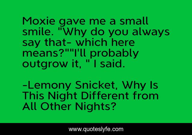 This page presents the quote "Moxie gave me a small smile. "Why do you always say that- which here means?""I'll probably outgrow it, " I said.". Author of this quote is Lemony Snicket, Why Is This Night Different from All Other Nights?. This quote is about irony, speech, lemony-snicket, quirk,.