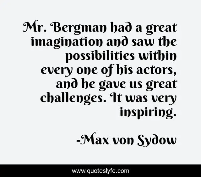 This page presents the quote "Mr. Bergman had a great imagination and saw the possibilities within every one of his actors, and he gave us great challenges. It was very inspiring.". Author of this quote is Max von Sydow. This quote is about challenges, great, within,.