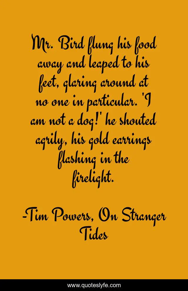 This page presents the quote "Mr. Bird flung his food away and leaped to his feet, glaring around at no one in particular. 'I am not a dog!' he shouted agrily, his gold earrings flashing in the firelight.". Author of this quote is Tim Powers, On Stranger Tides. This quote is about pirates, seas, ocean, youth, nautical, ship, captain, pirate,.