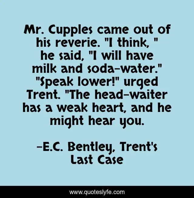 This page presents the quote "Mr. Cupples came out of his reverie. "I think, " he said, "I will have milk and soda-water." "Speak lower!" urged Trent. "The head-waiter has a weak heart, and he might hear you.". Author of this quote is E.C. Bentley, Trent's Last Case. This quote is about amateur-detective, humor, humour,.