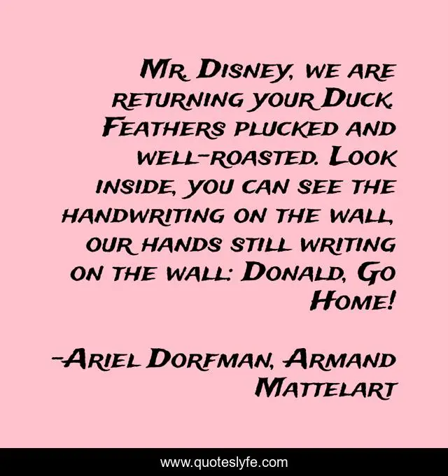 This page presents the quote "Mr. Disney, we are returning your Duck. Feathers plucked and well-roasted. Look inside, you can see the handwriting on the wall, our hands still writing on the wall: Donald, Go Home!". Author of this quote is Ariel Dorfman, Armand Mattelart. This quote is about chilean-revolution, imperialism, capitalism,.