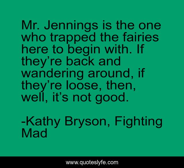 This page presents the quote "Mr. Jennings is the one who trapped the fairies here to begin with. If they’re back and wandering around, if they’re loose, then, well, it’s not good.". Author of this quote is Kathy Bryson, Fighting Mad. This quote is about leprechauns, humor, fairies, romance, fantasy, fighting-mad,.