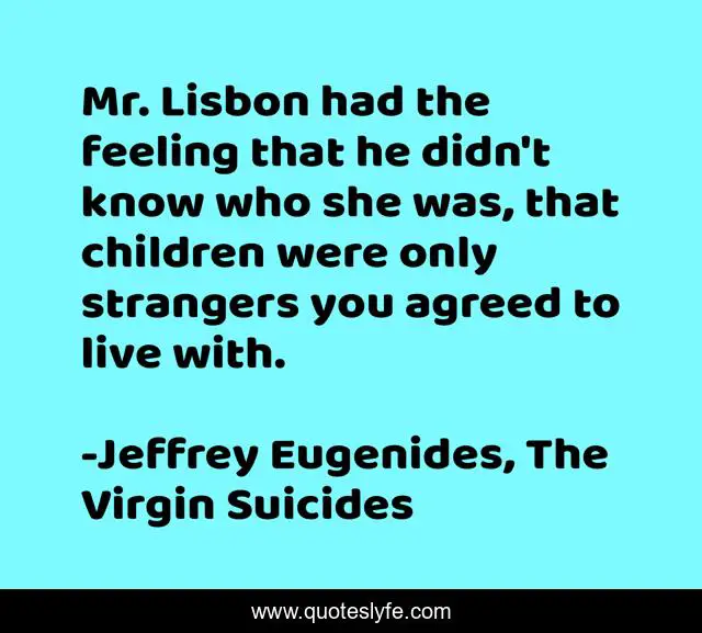 This page presents the quote "Mr. Lisbon had the feeling that he didn't know who she was, that children were only strangers you agreed to live with.". Author of this quote is Jeffrey Eugenides, The Virgin Suicides. This quote is about strangers, parents, children, the-virgin-suicides,.