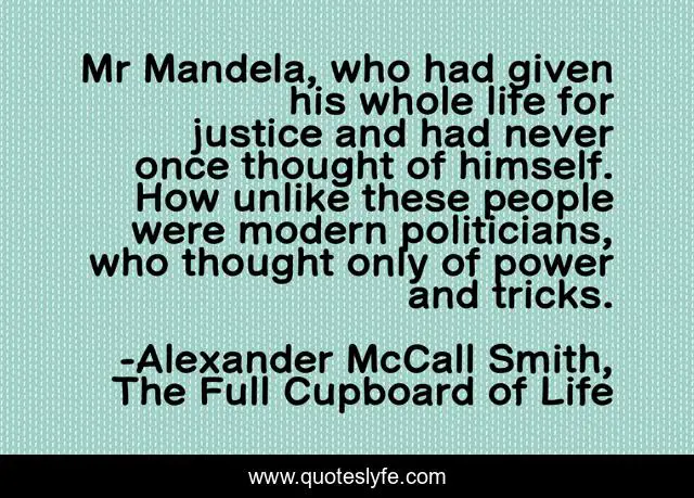 This page presents the quote "Mr Mandela, who had given his whole life for justice and had never once thought of himself. How unlike these people were modern politicians, who thought only of power and tricks.". Author of this quote is Alexander McCall Smith, The Full Cupboard of Life. This quote is about justice, politicians, leadership,.