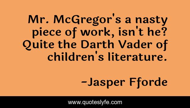 This page presents the quote "Mr. McGregor's a nasty piece of work, isn't he? Quite the Darth Vader of children's literature.". Author of this quote is Jasper Fforde. This quote is about peter-rabbit, humor,.