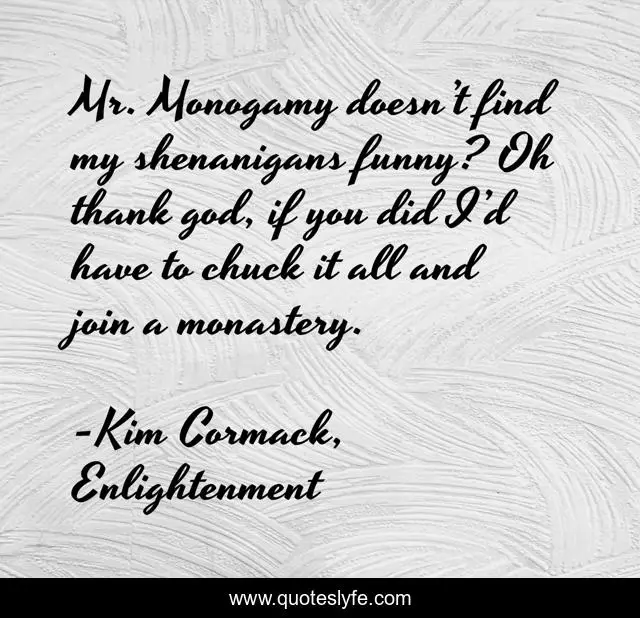 This page presents the quote "Mr. Monogamy doesn’t find my shenanigans funny? Oh thank god, if you did I’d have to chuck it all and join a monastery.". Author of this quote is Kim Cormack, Enlightenment. This quote is about immortality, comedy, immortal,.