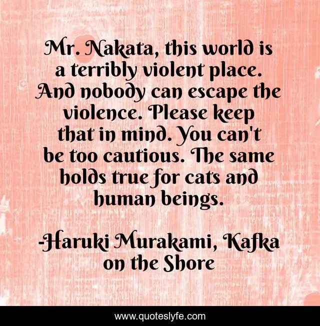 This page presents the quote "Mr. Nakata, this world is a terribly violent place. And nobody can escape the violence. Please keep that in mind. You can't be too cautious. The same holds true for cats and human beings.". Author of this quote is Haruki Murakami, Kafka on the Shore. .