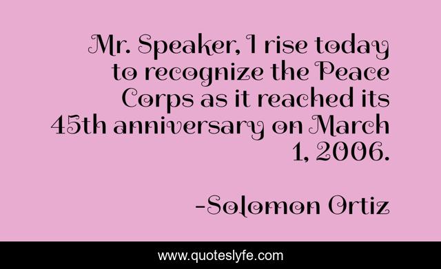 This page presents the quote "Mr. Speaker, I rise today to recognize the Peace Corps as it reached its 45th anniversary on March 1, 2006.". Author of this quote is Solomon Ortiz. This quote is about rise, peace, today,.