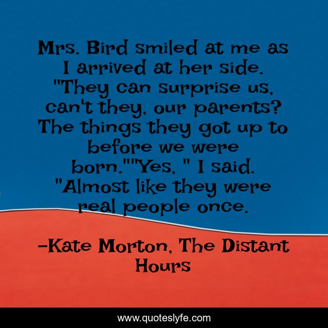 This page presents the quote "Mrs. Bird smiled at me as I arrived at her side. "They can surprise us, can't they, our parents? The things they got up to before we were born.""Yes, " I said. "Almost like they were real people once.". Author of this quote is Kate Morton, The Distant Hours. This quote is about relationships, parents,.