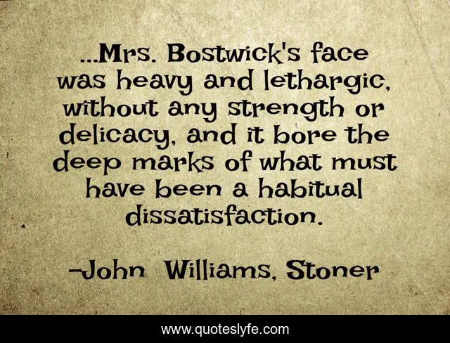 This page presents the quote "...Mrs. Bostwick's face was heavy and lethargic, without any strength or delicacy, and it bore the deep marks of what must have been a habitual dissatisfaction.". Author of this quote is John Williams, Stoner. This quote is about disappointment, dissatisfaction,.