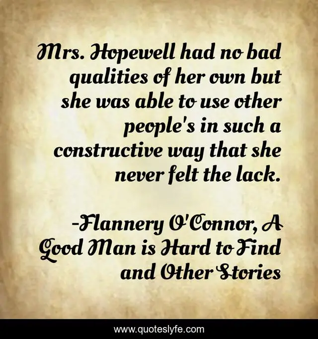 "Flannery O'Connor, A Good Man is Hard to Find and Other Stories Quotes." Quoteslyfe.com, 2025. Mon. 08 Dec. 2025. <https://www.quoteslyfe.com/quote/Mrs-Hopewell-had-no-bad-qualities-of-173422>.