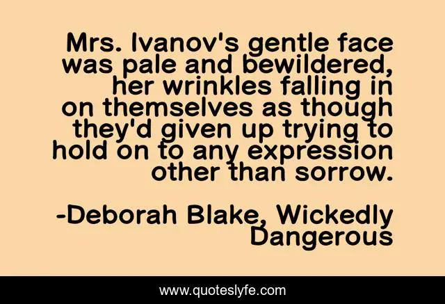 This page presents the quote "Mrs. Ivanov's gentle face was pale and bewildered, her wrinkles falling in on themselves as though they'd given up trying to hold on to any expression other than sorrow.". Author of this quote is Deborah Blake, Wickedly Dangerous. This quote is about paranormal-romance, witches, dragons,.