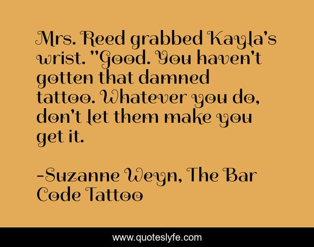 This page presents the quote "Mrs. Reed grabbed Kayla's wrist. "Good. You haven't gotten that damned tattoo. Whatever you do, don't let them make you get it.". Author of this quote is Suzanne Weyn, The Bar Code Tattoo. This quote is about mysterious, thriller,.
