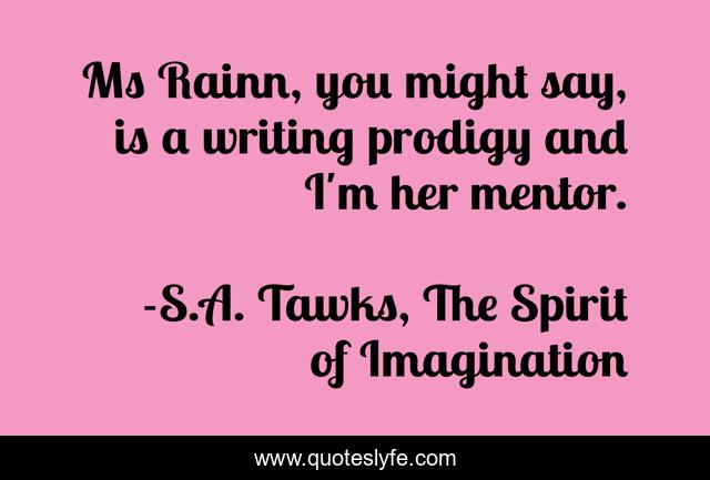 This page presents the quote "Ms Rainn, you might say, is a writing prodigy and I'm her mentor.". Author of this quote is S.A. Tawks, The Spirit of Imagination. This quote is about spirituality, author, writing, imagination, reader, reading,.