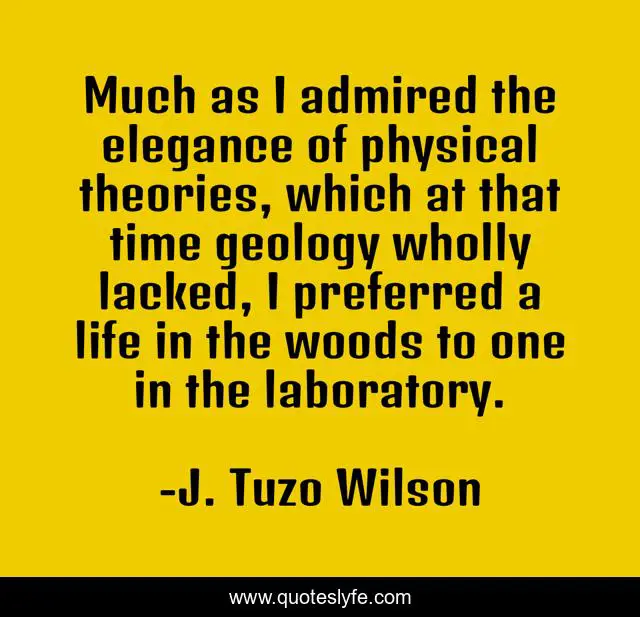 This page presents the quote "Much as I admired the elegance of physical theories, which at that time geology wholly lacked, I preferred a life in the woods to one in the laboratory.". Author of this quote is J. Tuzo Wilson. This quote is about scenery, admiration, geology, science, plate-tectonics, nature, life, lab, theories,.