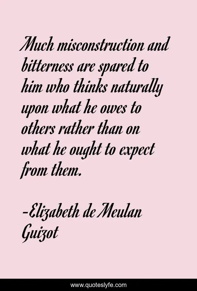 This page presents the quote "Much misconstruction and bitterness are spared to him who thinks naturally upon what he owes to others rather than on what he ought to expect from them.". Author of this quote is Elizabeth de Meulan Guizot. This quote is about helping, people,.