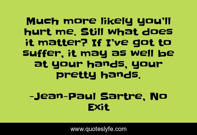 This page presents the quote "Much more likely you’ll hurt me. Still what does it matter? If I’ve got to suffer, it may as well be at your hands, your pretty hands.". Author of this quote is Jean-Paul Sartre, No Exit. .