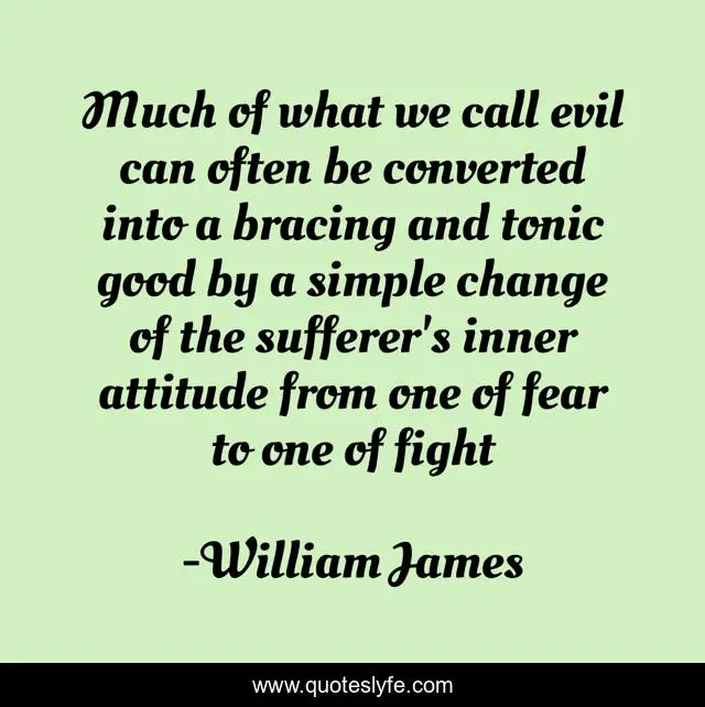 This page presents the quote "Much of what we call evil can often be converted into a bracing and tonic good by a simple change of the sufferer's inner attitude from one of fear to one of fight". Author of this quote is William James. This quote is about fear, good, inner-attitude, call-evil, fight,.