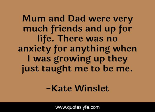 This page presents the quote "Mum and Dad were very much friends and up for life. There was no anxiety for anything when I was growing up they just taught me to be me.". Author of this quote is Kate Winslet. This quote is about life, anxiety, friends,.