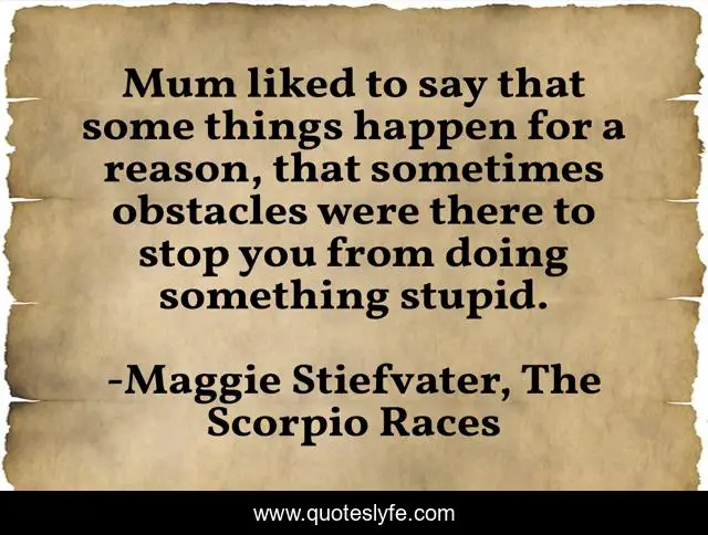 This page presents the quote "Mum liked to say that some things happen for a reason, that sometimes obstacles were there to stop you from doing something stupid.". Author of this quote is Maggie Stiefvater, The Scorpio Races. This quote is about hard-truths, wisdom,.