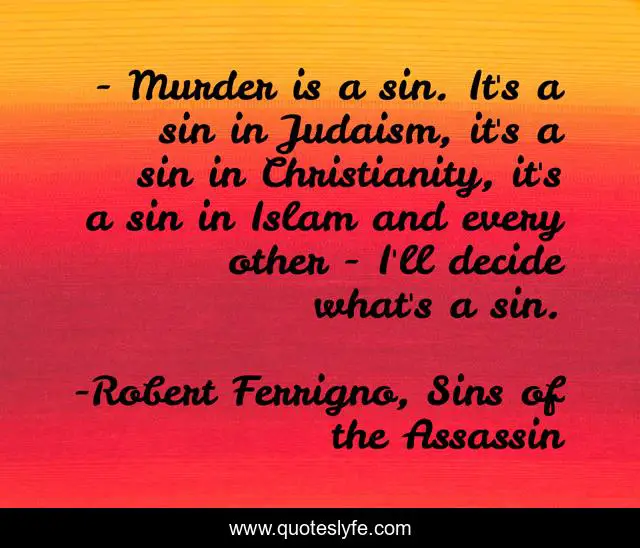 This page presents the quote "- Murder is a sin. It's a sin in Judaism, it's a sin in Christianity, it's a sin in Islam and every other…- I'll decide what's a sin.". Author of this quote is Robert Ferrigno, Sins of the Assassin. .