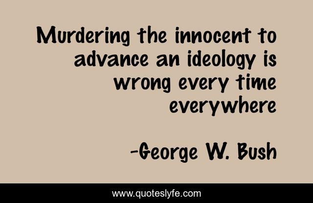 This page presents the quote "Murdering the innocent to advance an ideology is wrong every time everywhere". Author of this quote is George W. Bush. .
