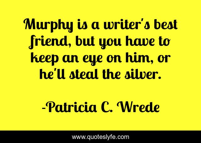 This page presents the quote "Murphy is a writer's best friend, but you have to keep an eye on him, or he'll steal the silver.". Author of this quote is Patricia C. Wrede. This quote is about writers-on-writing, writing-craft, writing,.