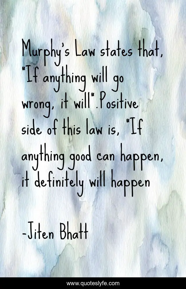 This page presents the quote "Murphy's Law states that, "If anything will go wrong, it will".Positive side of this law is, "If anything good can happen, it definitely will happen". Author of this quote is Jiten Bhatt. This quote is about confidence, positive, motivational, positive-thinking, optimistic, inspirational, enthusiasm, murphy-s-law,.