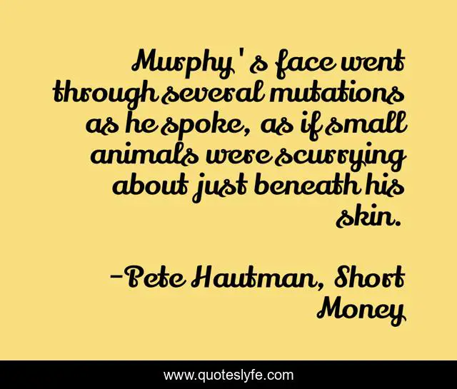 This page presents the quote "Murphy's face went through several mutations as he spoke, as if small animals were scurrying about just beneath his skin.". Author of this quote is Pete Hautman, Short Money. This quote is about series, crime, hunting, gambling,.