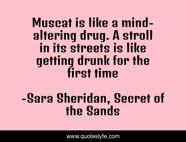 This page presents the quote "Muscat is like a mind-altering drug. A stroll in its streets is like getting drunk for the first time". Author of this quote is Sara Sheridan, Secret of the Sands. This quote is about drugs, muscat, drunk,.
