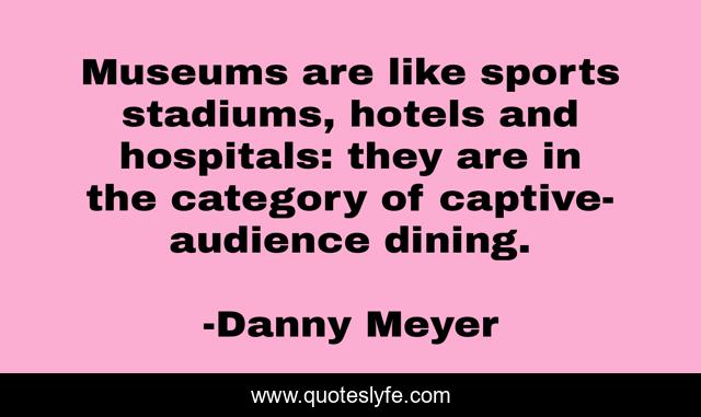 This page presents the quote "Museums are like sports stadiums, hotels and hospitals: they are in the category of captive-audience dining.". Author of this quote is Danny Meyer. This quote is about museums, dining, hospitals,.