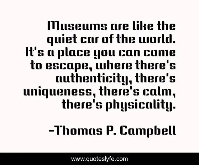 This page presents the quote "Museums are like the quiet car of the world. It's a place you can come to escape, where there's authenticity, there's uniqueness, there's calm, there's physicality.". Author of this quote is Thomas P. Campbell. This quote is about world, calm, escape,.