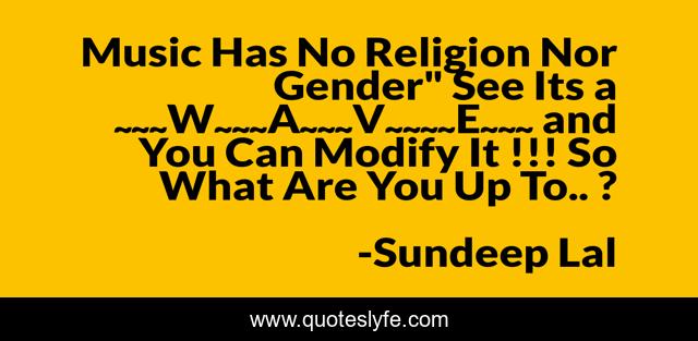 This page presents the quote "Music Has No Religion Nor Gender" See Its a ___W___A___V____E___ and You Can Modify It !!! So What Are You Up To.. ?". Author of this quote is Sundeep Lal. This quote is about gender, religion, music, wave,.