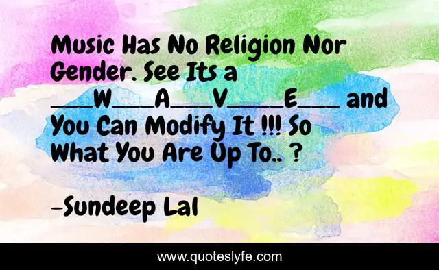 This page presents the quote "Music Has No Religion Nor Gender. See Its a ___W___A___V____E___ and You Can Modify It !!! So What You Are Up To.. ?". Author of this quote is Sundeep Lal. This quote is about gender, religion, music, wave,.