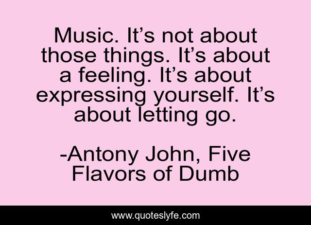 This page presents the quote "Music. It’s not about those things. It’s about a feeling. It’s about expressing yourself. It’s about letting go.". Author of this quote is Antony John, Five Flavors of Dumb. This quote is about letting-go, inspiring, music, feelings,.