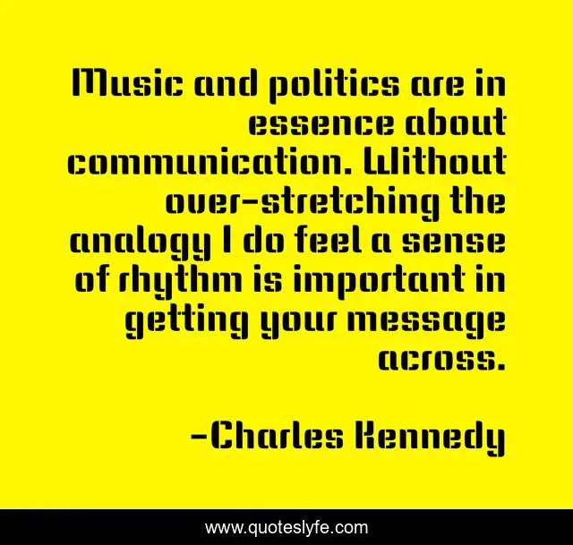 This page presents the quote "Music and politics are in essence about communication. Without over-stretching the analogy I do feel a sense of rhythm is important in getting your message across.". Author of this quote is Charles Kennedy. This quote is about politics, important, music,.