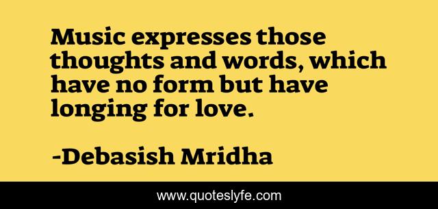 This page presents the quote "Music expresses those thoughts and words, which have no form but have longing for love.". Author of this quote is Debasish Mridha. This quote is about life, love, knowledge, inspirational, intelligence, philosophy, wisdom, quotes, affection,.