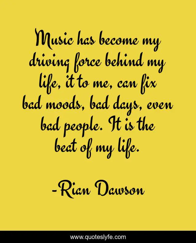 This page presents the quote "Music has become my driving force behind my life, it to me, can fix bad moods, bad days, even bad people. It is the beat of my life.". Author of this quote is Rian Dawson. This quote is about hapiness, music, spirituality,.
