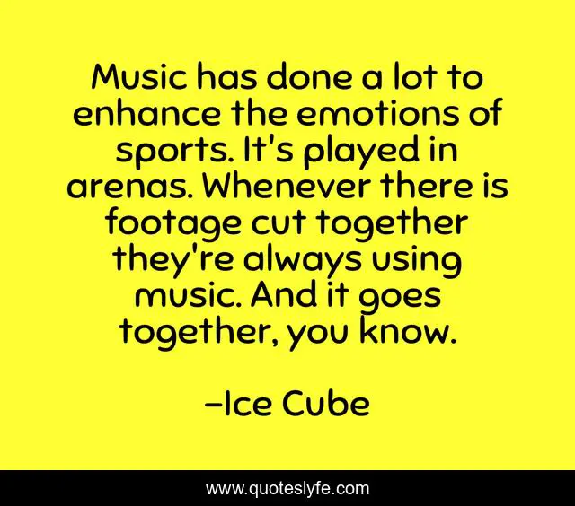 This page presents the quote "Music has done a lot to enhance the emotions of sports. It's played in arenas. Whenever there is footage cut together they're always using music. And it goes together, you know.". Author of this quote is Ice Cube. This quote is about music, together,.