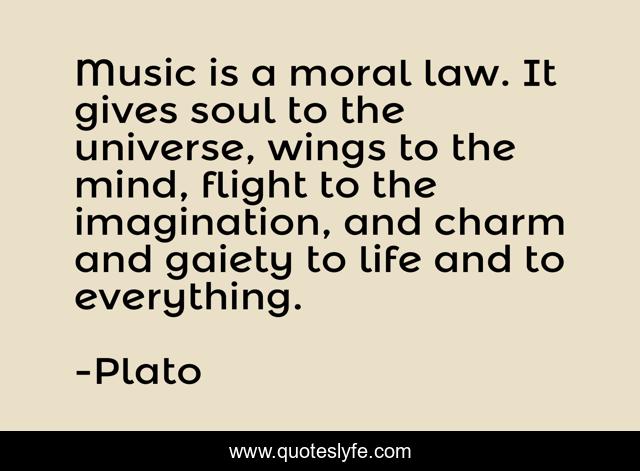 This page presents the quote "Music is a moral law. It gives soul to the universe, wings to the mind, flight to the imagination, and charm and gaiety to life and to everything.". Author of this quote is Plato. This quote is about imagination, life, law,.