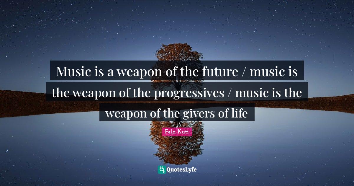 This page presents the quote "Music is a weapon of the future / music is the weapon of the progressives / music is the weapon of the givers of life". Author of this quote is Fela Kuti. This quote is about music is, life, weapons, future, giver,.