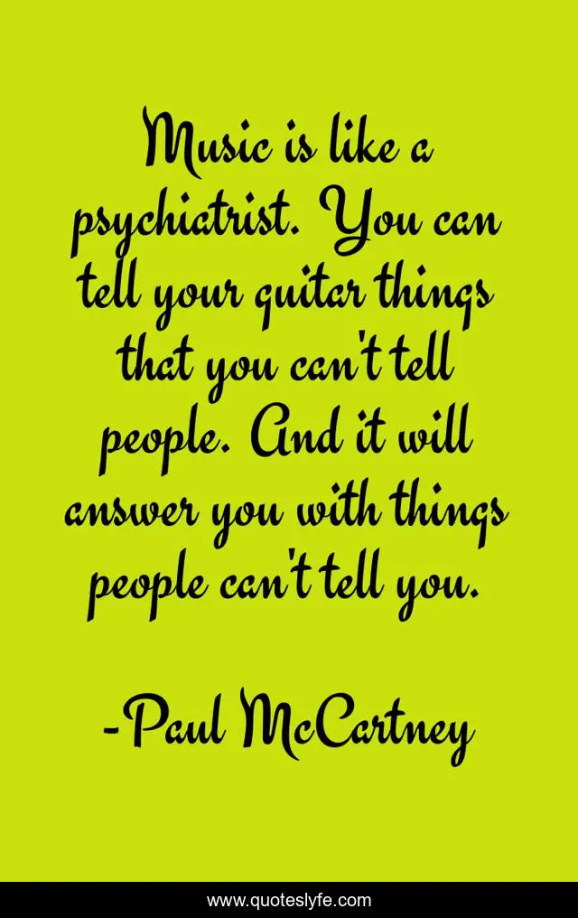 This page presents the quote "Music is like a psychiatrist. You can tell your guitar things that you can't tell people. And it will answer you with things people can't tell you.". Author of this quote is Paul McCartney. This quote is about beatles, music, rock-star,.