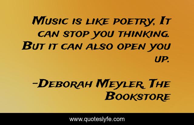 This page presents the quote "Music is like poetry, It can stop you thinking. But it can also open you up.". Author of this quote is Deborah Meyler, The Bookstore. This quote is about music, poetry,.