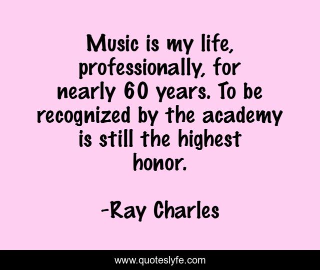 This page presents the quote "Music is my life, professionally, for nearly 60 years. To be recognized by the academy is still the highest honor.". Author of this quote is Ray Charles. This quote is about life, my life, honor,.