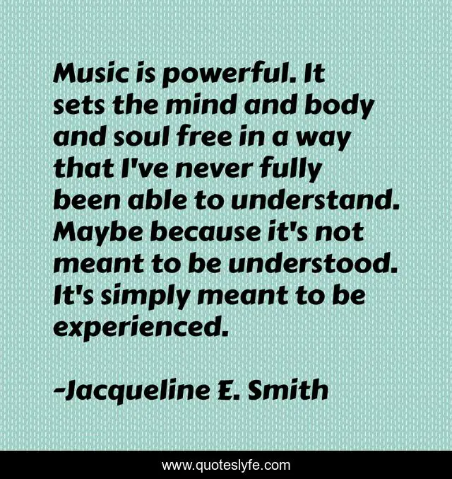 This page presents the quote "Music is powerful. It sets the mind and body and soul free in a way that I've never fully been able to understand. Maybe because it's not meant to be understood. It's simply meant to be experienced.". Author of this quote is Jacqueline E. Smith. This quote is about worldwide, music,.
