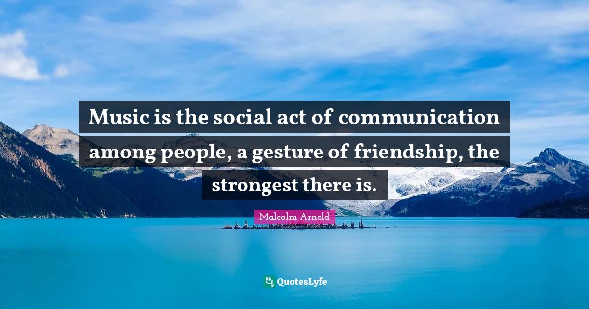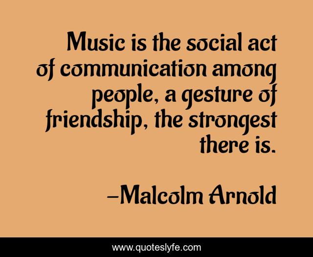 This page presents the quote "Music is the social act of communication among people, a gesture of friendship, the strongest there is.". Author of this quote is Malcolm Arnold. This quote is about friendship, music, people,.
